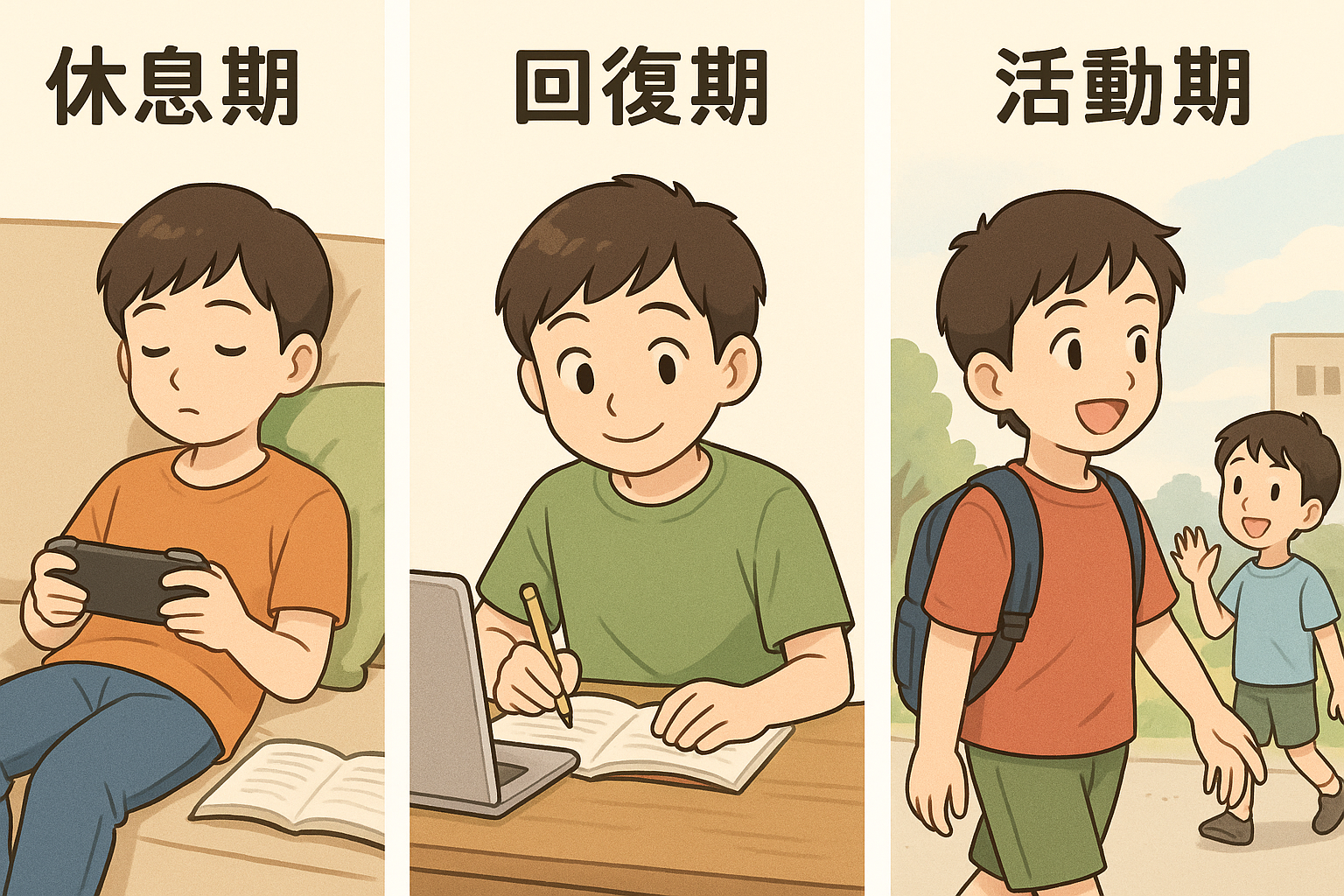 その際に意識したいのが、「休息期」「回復期」「活動期」の3つです。お子さんが今どのような状況にあるのか様子をうかがいながら、サポートしていきましょう。