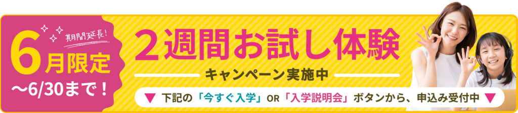 5月限定で実施していた「2週間お試し体験キャンペーン」ですが、ご好評につき6月末まで延長することになりました。
