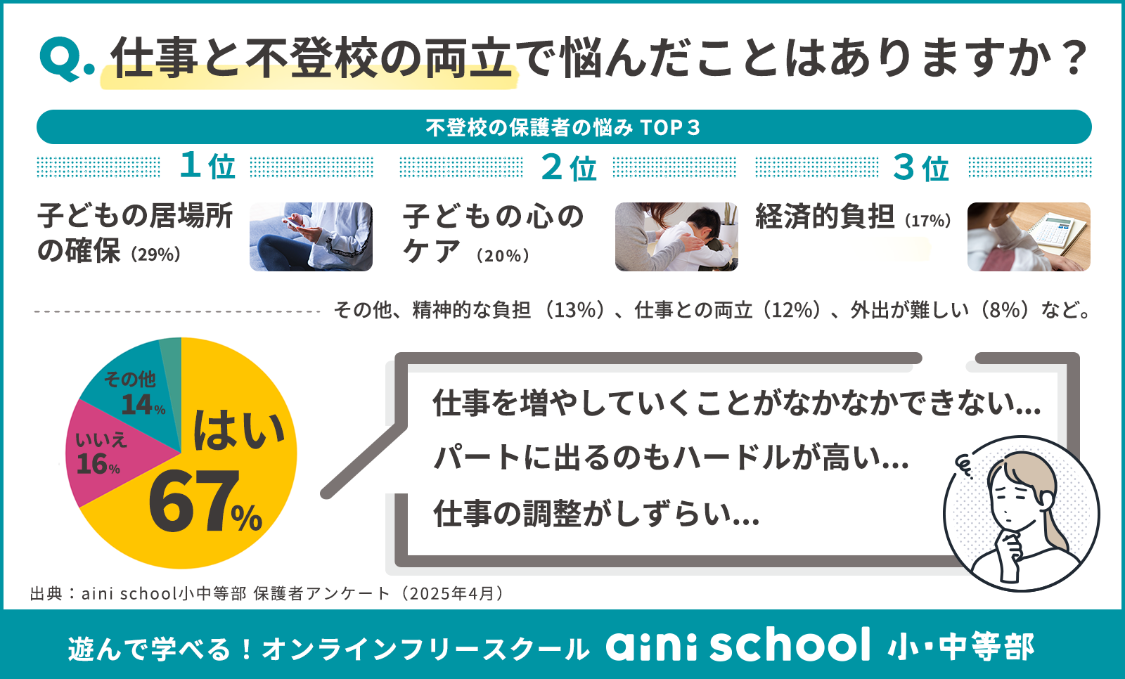 今回の調査では、「子どもの不登校と仕事の両立」に関する実態に迫る内容となっており、約7割の保護者が両立に悩んだ経験があると回答。また、aini schoolに入学した後、5割以上の小学生保護者が「仕事に良い影響があった」と実感していることもわかりました。さらに、保護者の中には「不登校離職」のリスクに直面した方もおり、仕事と育児の両立における深刻な課題が浮き彫りになっています。