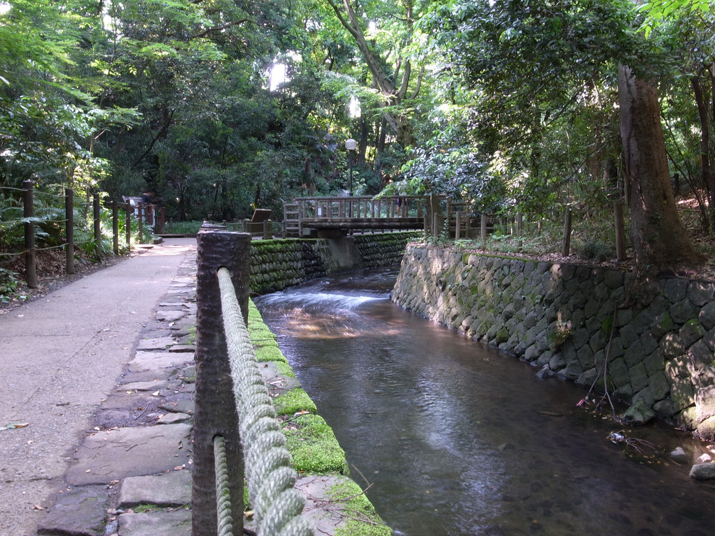 多摩川に続く谷沢川の緩やかな流れが心地よく、気温が上がる夏の間も地元の人が通う癒やしスポットになります。