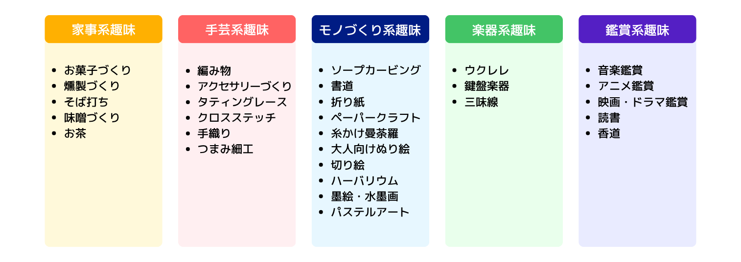 家で楽しめる趣味にまつわる体験も多く開催されており、主に以下の5ジャンルに分けられます。