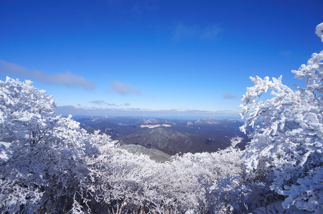 霧氷が見られることでしられる「三峰山」では、氷の華と言われる「樹氷」を堪能できます。毎年1月中頃から2月下旬まで、三峰山霧氷まつりが開催され、地元御杖村の方々が野菜汁を振舞ってくれます。登山は、三峰山登山口から登るコースがトレッキング初心者の一般的なコースです。また、初夏は白つつじ、秋は登山しながら紅葉模様を楽しめ、四季折々の風景もみどころです。