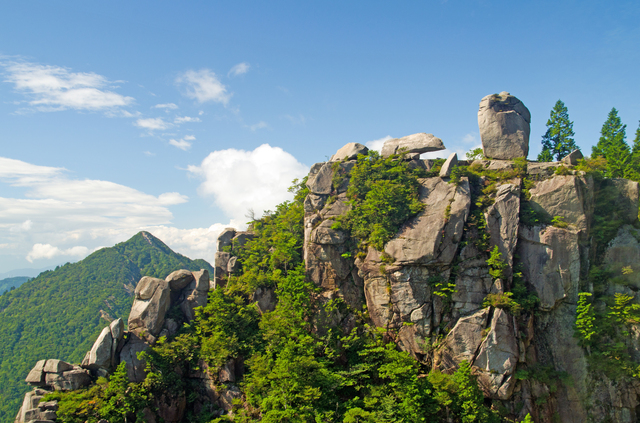 御在所岳(ございしょだけ)は、山頂まで続くロープウェイもありますが、ロープウェイ乗り場から歩いて山頂を目指すのも登山の楽しみ。途中、ロッククライミングの練習場となる藤内壁を望む兎の耳を通り、さらに山頂付近までトレッキングすると、富士見岩が見えてきます。山頂付近にある望湖台からの眺めは絶景。山頂まで登りきった満足感とともに、素晴らしい景色を堪能しましょう。
