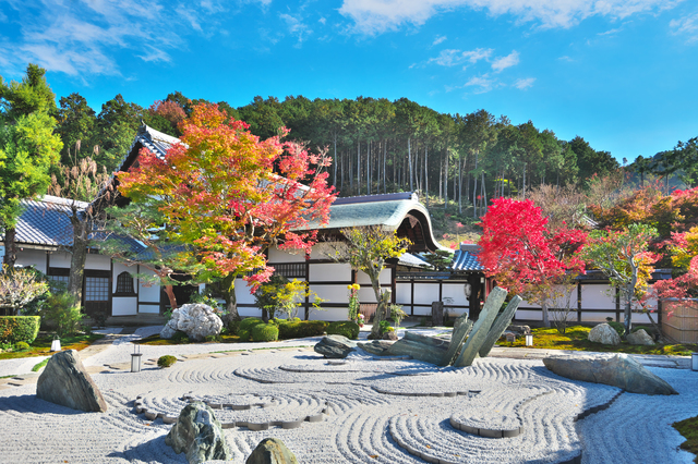 1601年(慶長6年)徳川家康が学校として建立した圓光寺。鮮やかに色づいた木々と庭園のコントラストが美しく、名所の多い京都の中でも、特に人気の紅葉スポットです。