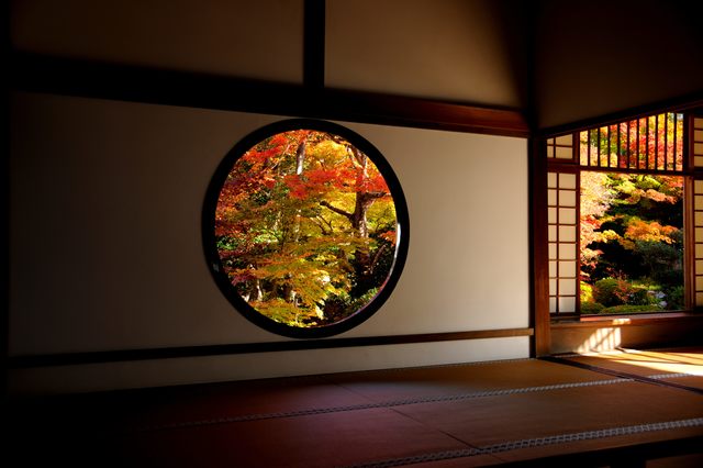 源光庵は、本堂にある丸い「悟りの窓」と四角い「迷いの窓」が有名です。悟りの窓の丸い形は大宇宙を、迷いの窓の四角い形は生老病死の四苦八苦を表しているといわれています。窓の外の紅葉は一枚の絵のようにため息が出るほど美しくとても風情があります。外を眺めながら自分自身と対話することで新たな発見があるかもしれません。