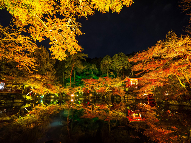 五重塔が綺麗に写り込む11月中旬〜11月下旬が見頃です。東寺では夜間ライトアップを行っています。一味違う紅葉を体感してください。