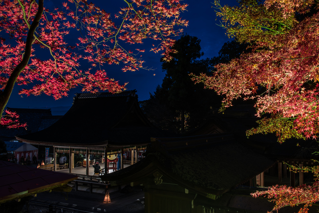 参道から本殿に至るまでに約300本のカエデがあり、様々な角度から紅葉を楽しむことができます。紅葉と神社の朱塗りとの相性は抜群です。