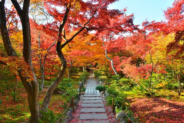 11月末頃には境内は朱色と黄色の紅葉一色に染まり、時間が経つにつれてもみじのじゅうたんができあがります。宝筐院は小さなお寺ですが、美しい庭園と落ち着いたつくりのなかでの散策は見応え充分。紅葉と石畳の上のもみじのトンネルは最高です。