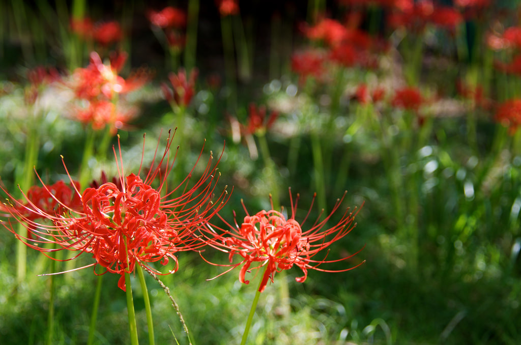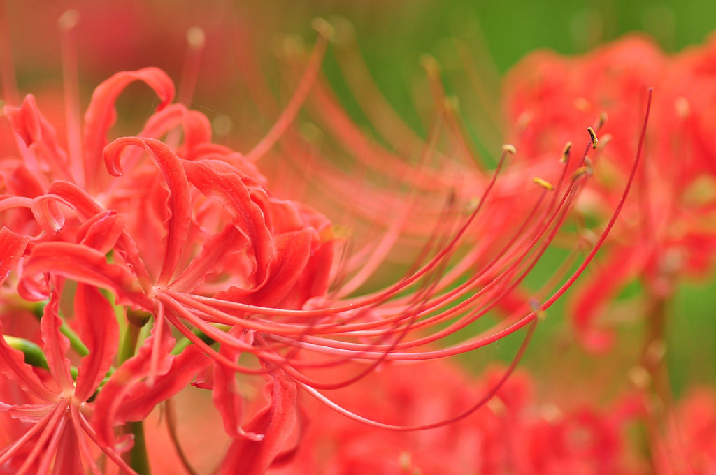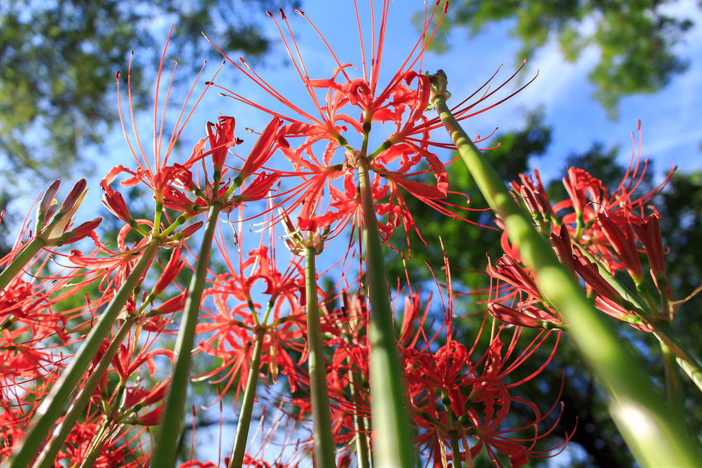 スッと伸びた緑色の茎に、真っ赤な細い花びらをつける曼珠沙華(まんじゅしゃか、まんじゅしゃげ)。「彼岸花(ひがんばな)」として知られる妖艶な雰囲気を持つお花です。田んぼの畦道などに群生し、9月中旬に赤い花をつけるため、お彼岸の頃に咲く花として親しまれています。