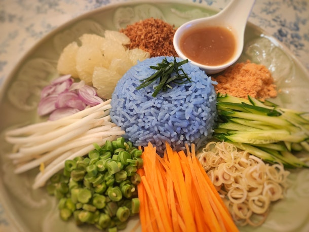 アンチャン(バターフライピー)で炊いたタイ米にレモングラス、コブミカン、などのフレッシュハーブたっぷりと生野菜&フルーツ、合計10種類以上をカラフルにお皿に盛り付けるとてもヘルシーで美味しい料理です。