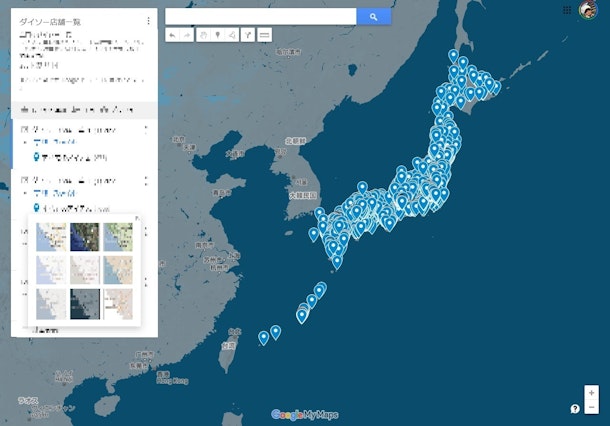 googleマップで日本地図を描く:百均のダイソ○全国店舗