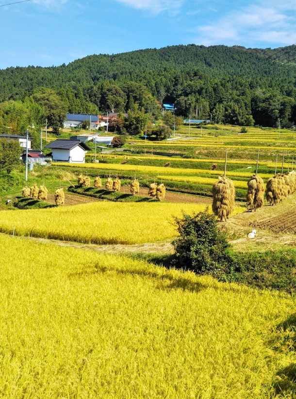 ちょうど稲刈りの季節、黄金色の稲穂をみながら、