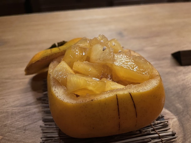 旬な柿をブランデーにつけて置き、白なるコメのウォッカであえて「柿の白和え」。