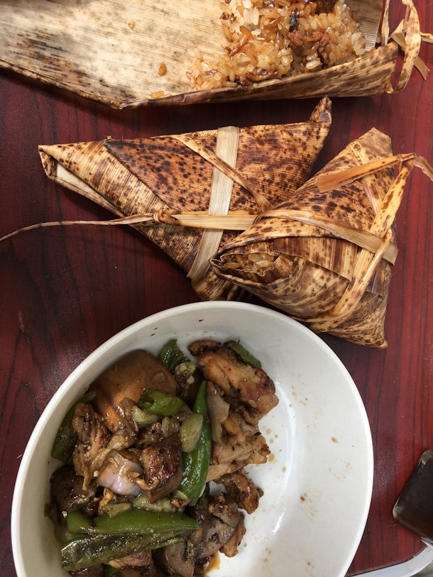 餅米を蒸し、ちまき作り。三角形は少し難しいですが、考えながら上手に出来ました!