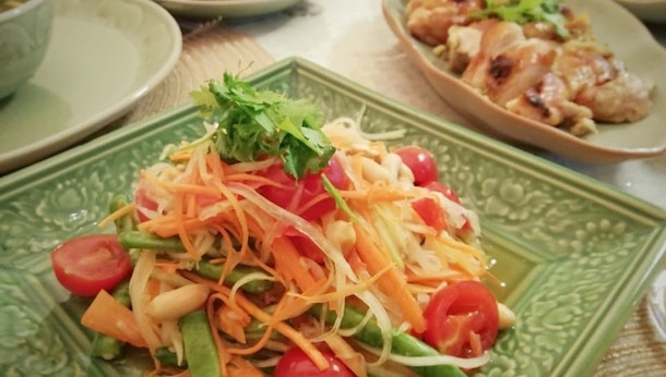 青パパイヤのシャキシャキ感がくせになる、ぴりっと辛いサラダです。