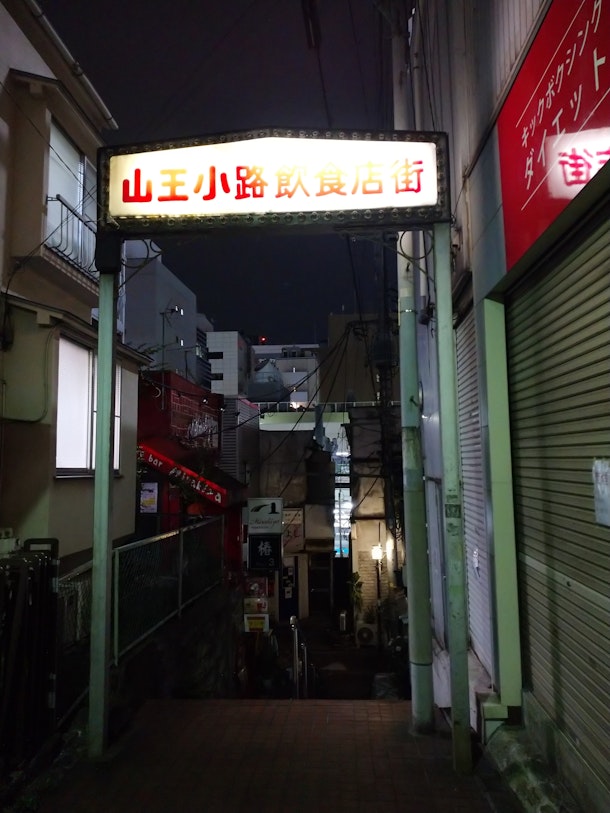大田区山王にある山王小路飲食店街。谷を降りたところにある飲食店街である事から、地獄谷との名称も。入口は全部で三つ。二つの入口にはレトロなネオン看板が。