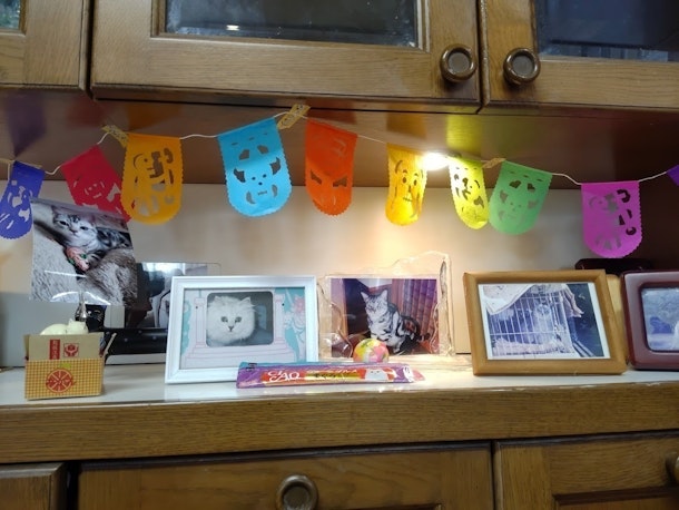 我が家も死者の日を真似てパぺルピカドで飾り付けをして、大好きだったおやつやおもちゃもお供えしました。