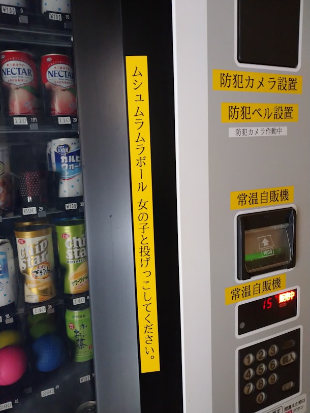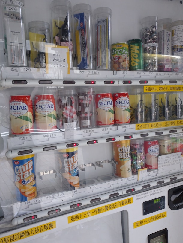 自動販売機の商品は実にバラエティーに富んでいて、清涼飲料水から始まり、お菓子、ポップコーン、焼き鳥、おでんや乾パン、〇〇ドームなどのラインナップになっている。極めつけはビー玉⁉カブトムシ⁉下ネタ満載のパッケージに包まれたチョコレートなんかも・・・・・・。