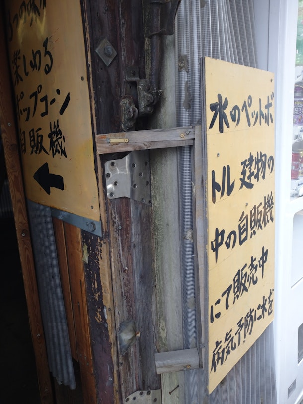 路地裏に佇む、恐怖⁉いやミステリアスな自動販売機群。ポップコーンなども売っている。