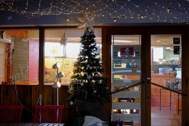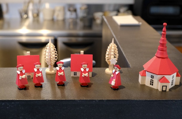 静かな住宅街にあつおしゃれカフェは、テーブルはミニチュアのクリスマスデコレーション。