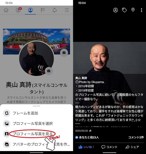 Facebookで繋がっていれば、プロフィール写真をクリックかタップすれば、写真の説明が読めます。