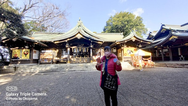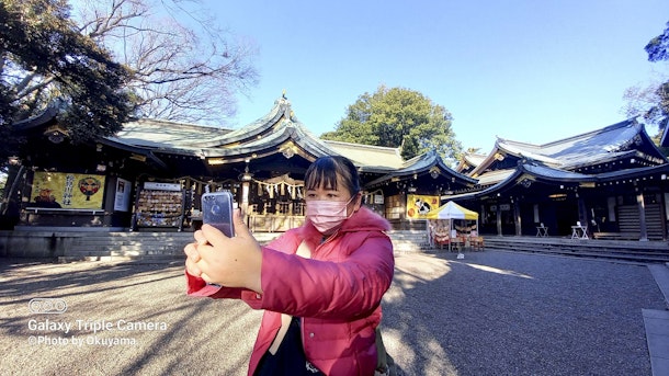 鳥居の前で、記念写真の撮り方のレクチャーとセルフィーショットの練習。