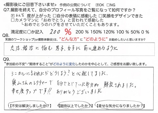 美顔エクササイズをお伝えしたあと、「かわいい」の瞬間が訪れ、終了となりまして、ご感想を書いていただきました。