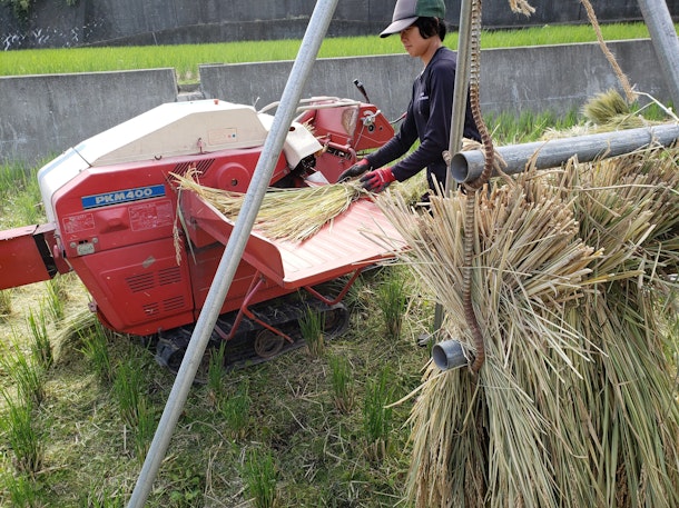 コメの水分量がちょうどよくなったタイミングで脱穀をします。
