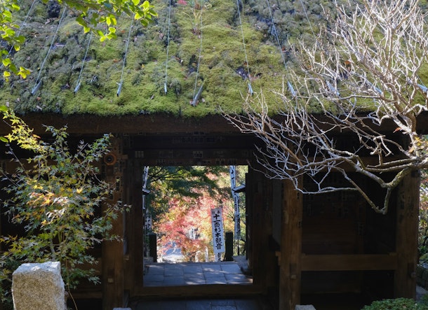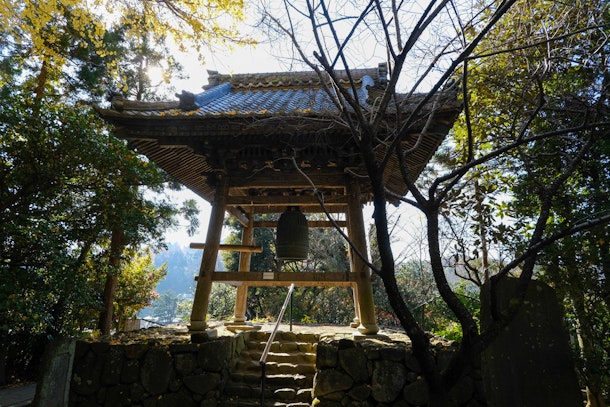 奈良時代、天平年間に創建されたという杉本寺がスタート地点。苔の石段は紅葉の錦に包まれていました。本堂横の鐘も凛として見えます。