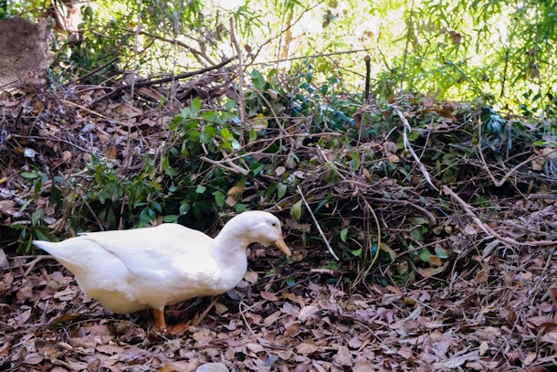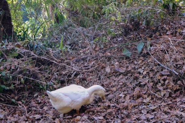 道中の森の道に現れたのは一羽のアヒルさん。日課のお散歩中のようです。