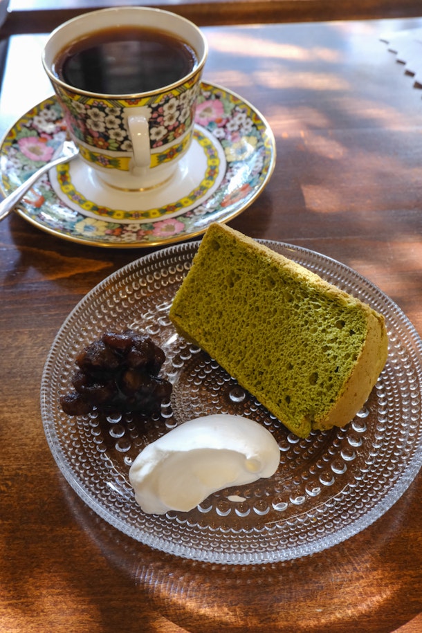 こちらは抹茶シフォンとハンドドリップコーヒー。ふっくら感が心地よい。