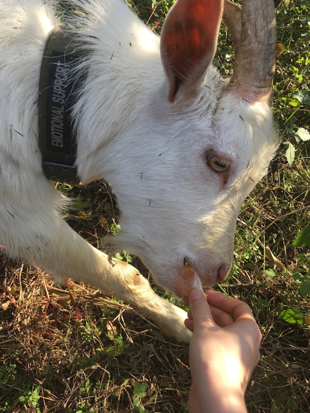 さっそくみかん狩り体験に参加してヤギのみかんちゃんと遊び、