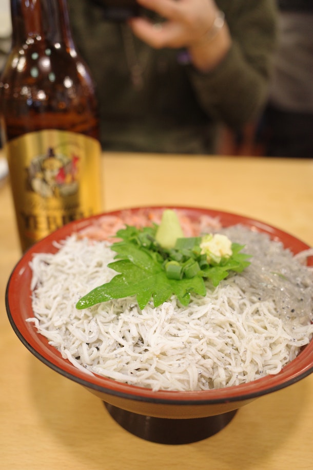 タクシーの運ちゃんオススメの”丸天”でブランチ。白エビ丼、しらす丼、アジフライをオーダー。休みなので朝だけど瓶ビールも(w)。周りは地元住民の方が多くてゆったりした時間が流れています。昼時はとっても混雑するので少し早めのブランチコースが◎。