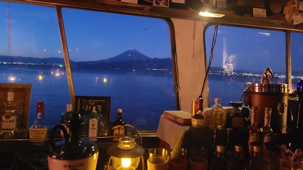 お片付けが完了したらThe Old Busに移動。(下に降りるだけなので30秒くらい)ちょうど夕日が沈んだ直後の美しいブルーの中を眺めながらウィスキーを頂きました。オーナーとまっつんが沼津情報を交換したりさっき巡ってきた沼津駅周辺のイベントの事話したりしてゆったりした時間を過ごしました。オーナーと奥様のセンスが秀逸すぎてため息が出まくったのでぜひHPチェックしてみて下さい。