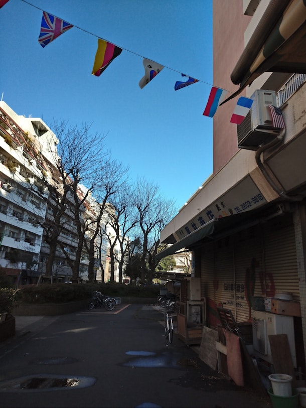 新宿区戸山の中心的な場所、戸山ハイツ。戦後に家が足りないために造られたとの事。都内の団地の先駆者と言われている。この一帯は元々は軍事施設だったらしい。一階のお店には北区の商店街でよく見かける、各国の旗が靡いている。ここは運動会が行われている運動場⁉