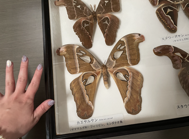 これは今日撮影してきた、世界一大きな蛾の標本です!(大人の手が小さく見える!!)