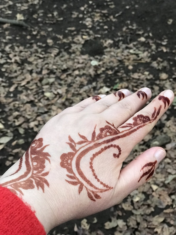 久しぶりというか何年間ぶりのヘナでとても嬉しい。トルコにもヘナの文化はありますし、結婚式の前のヘナパーティーとかもとても楽しいのですが、デザインなどの無いヘナで掌だけに丸くおいて、色を付けて終わり。