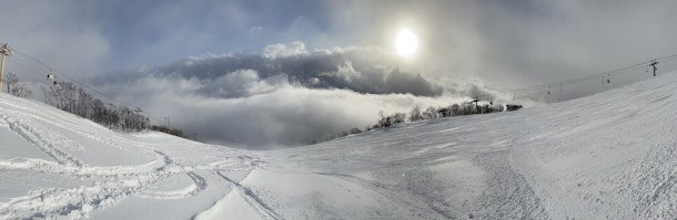 八方尾根でも有名なリーゼンスラロームから麓方面をパノラマで撮影。