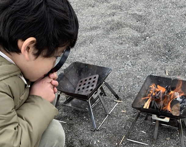 焚き火をすることで興味がそちらに向き、火おこしで使った虫眼鏡にも興味深々で