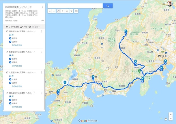 googleマップで主要な駅から静岡県沼津市までの自動車ルート