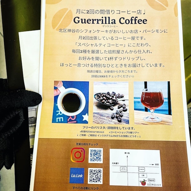 ポスターにはゲリラコーヒーの営業日程は入れていませんが、詳細は、QRからインスタグラム、リットリンクより随時チェックしていただけます☺︎