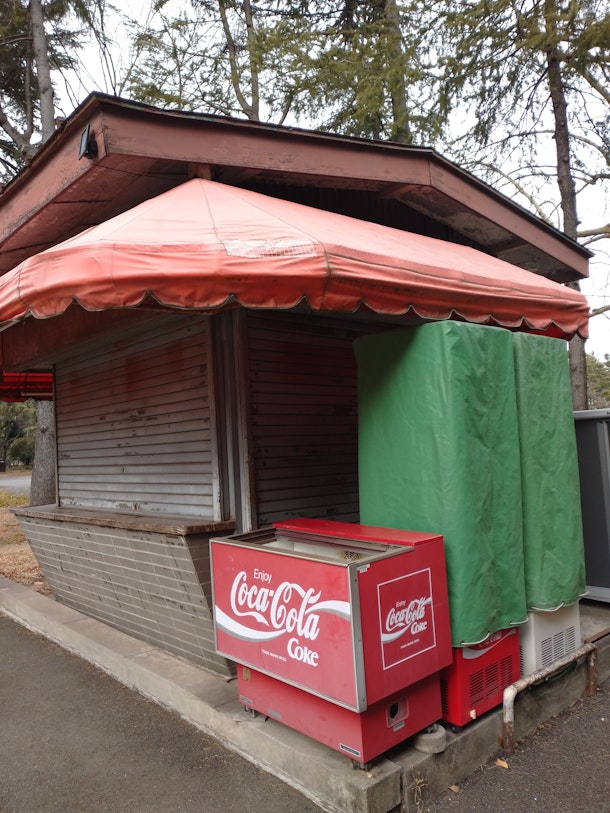 中央部にあるトタン屋根壁風の売店。看板もレトロ。