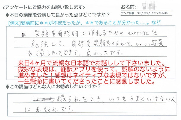笑顔を自然的に作れるための、エクササイズを勉強して、自然な笑顔を作れていい写真を撮られることが出来て、よかったです。撮られるときに、いつも、上手くいかない人にお勧めです。
