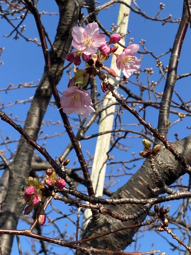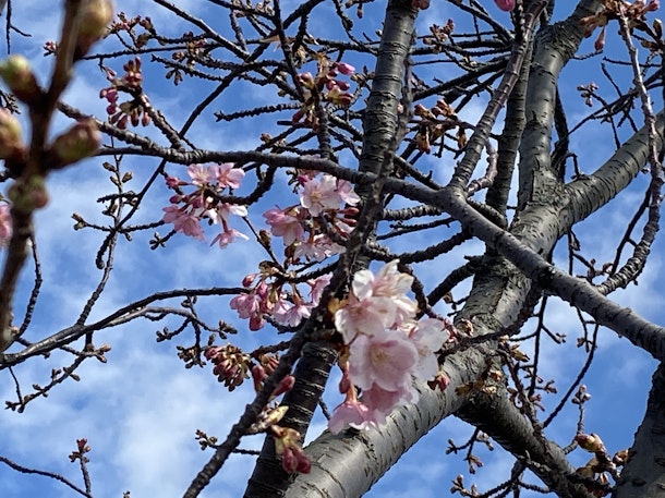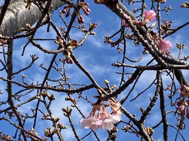 ソメイヨシノが咲く前に、河津桜が満開になります。まだ2分咲きぐらいですが、多くの人が桜を見にいらしていました!
