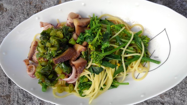 旬のヤリイカと合わせて、菜の花、椎茸、ふきのとうのパスタ。絶品💖