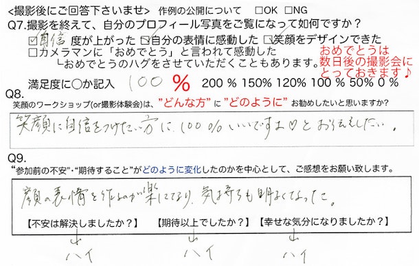 にお申し込みいただいておりまして、念のため、「撮られ慣れている方」向けですと、お伝えしたところ、「笑顔ワークショップ」をお申し込みいただく、という流れになりました。