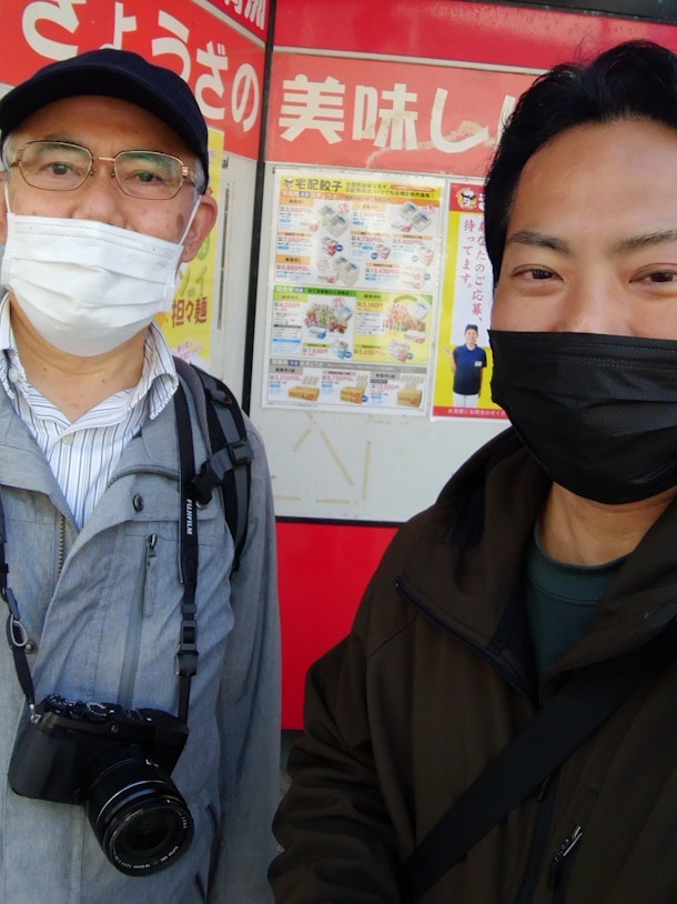 王道⁉写真家 上田氏と邪道⁉東京ガイド人 東京人世のツーショット。上田氏は王道なだけに素敵なカメラを装備し背筋もピンとしているが、私は昨晩のコーヒーの飲み過ぎか、はたまた花粉症のせいなのか、邪道なためか、目が腫れています。何故かバックの風景は餃子の満州⁉