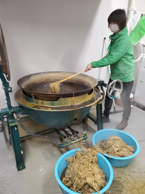 和紙の原料である楮を、大きな釜で煮終えたので(手前のタライへ)取り出しているところです♨️