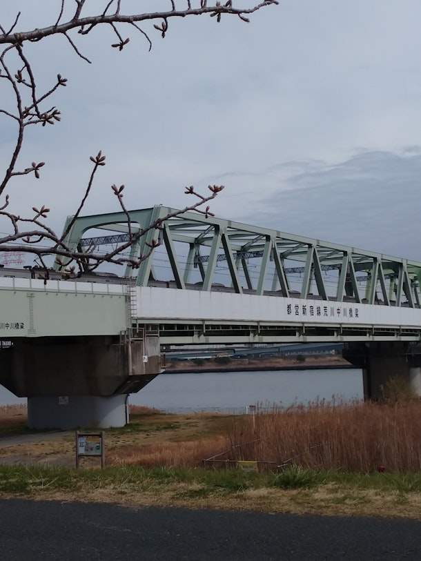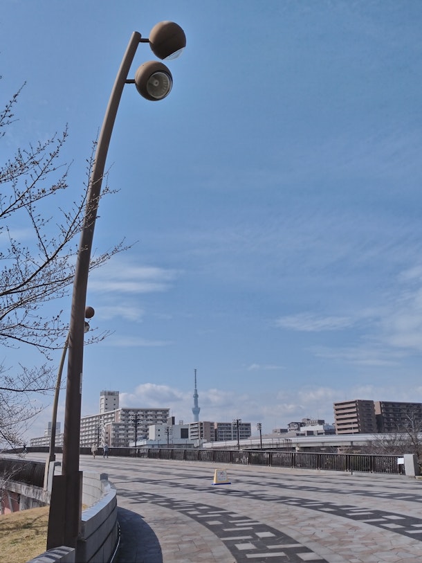 川の橋を渡ると江東区大島(こちらも数多くの団地が存在する。)に・・・奥の塔は墨田区押上に存在する、東京スカイツリー。