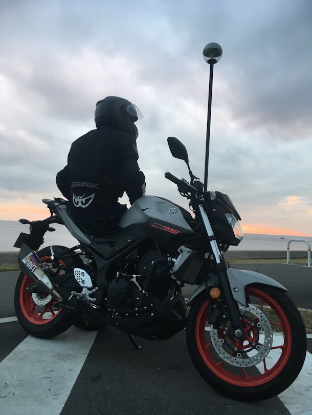 ↑愛車YAMAHAのMT-25と伊藤さんと夕陽